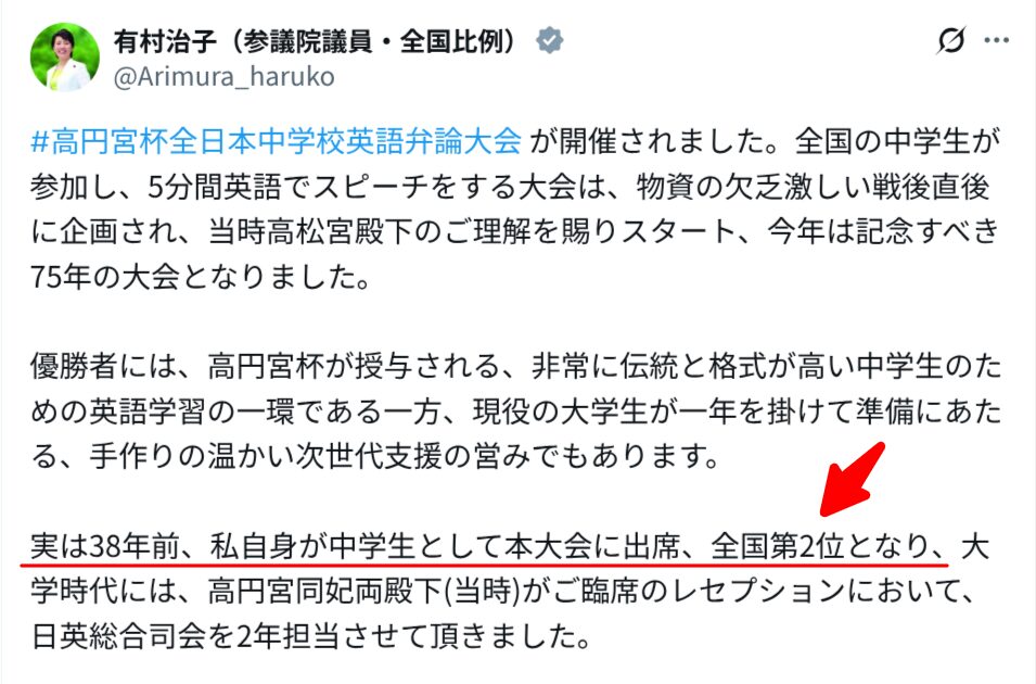 ただ、15歳の時に「全日本中学校英語弁論大会」に出場し、全国2位に入賞したそうです。⇩