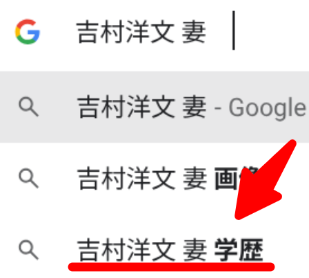こんな風に「吉村洋文 妻 学歴」というキーワードが自動で出てくるようになっているのですが、これは「吉村洋文 妻 学歴」というキーワードで一定数以上の検索がされている証拠。