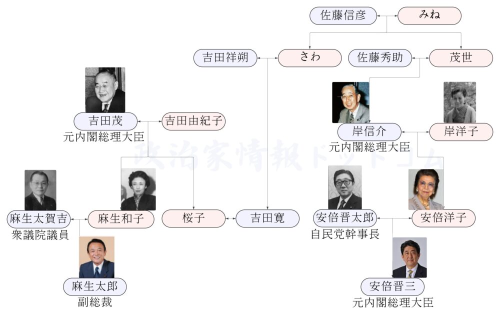 ご覧のとおり、麻生太郎氏と安倍晋三氏は血縁関係にありますがかなり遠い関係です。